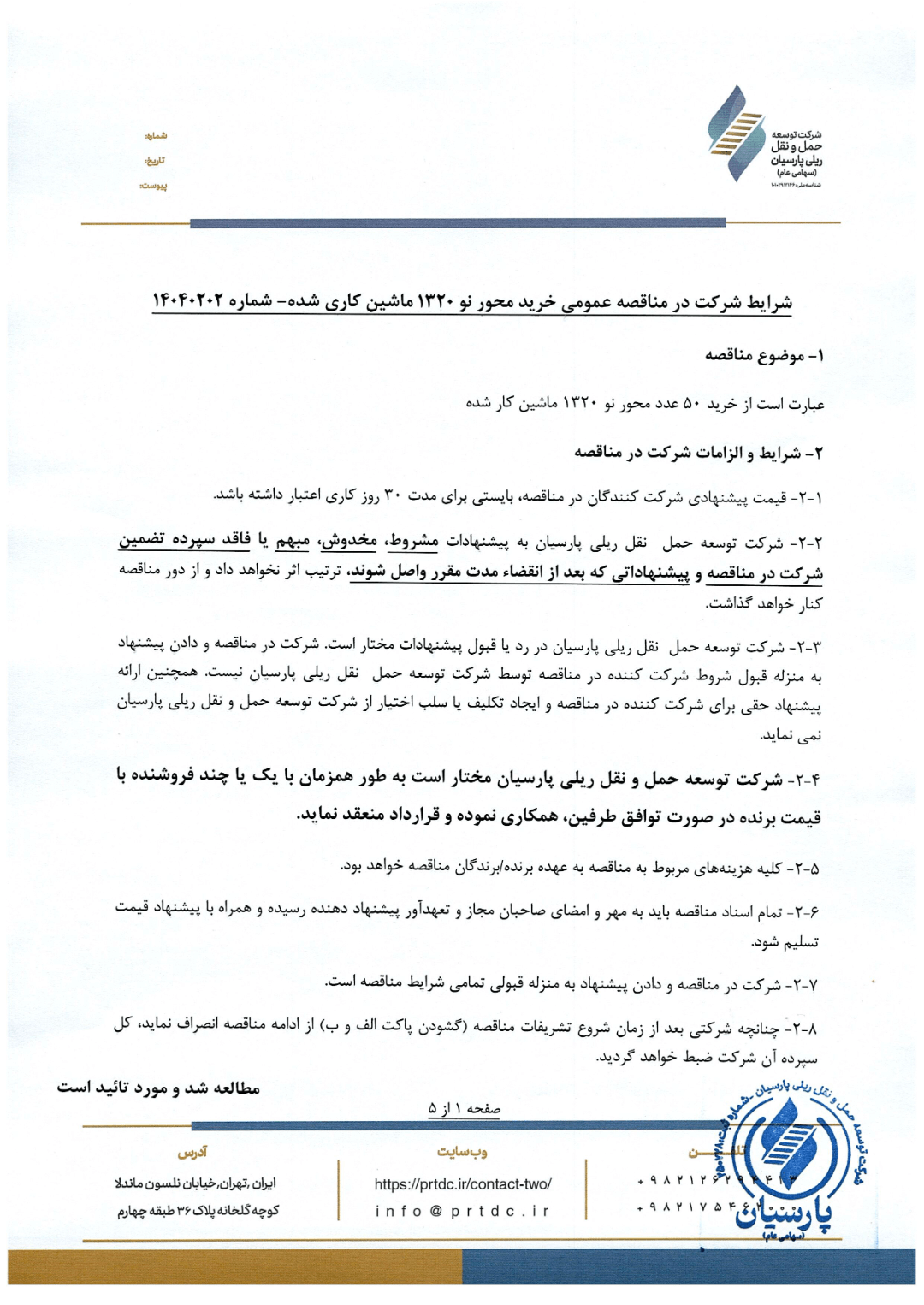 شرایط شرکت در مناقصه عمومی خرید محور نو 1320 ماشین کاری شده – شماره 14040202